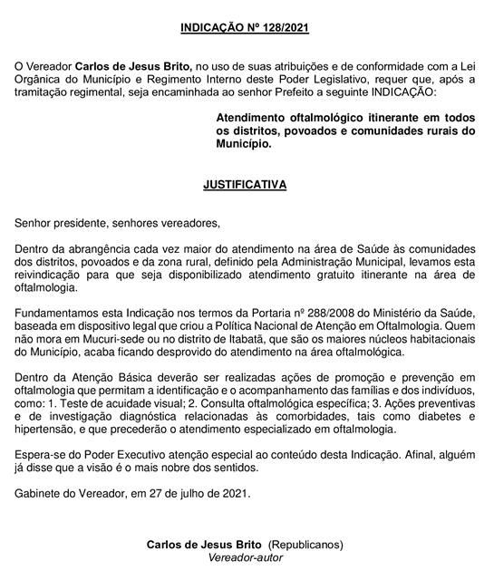 Atendimento oftalmológico itinerante gratuito em todos os distritos, povoados e comunidades rurais do Município, em ações de prevenção e tratamento, foi proposto pelo vereador Carlos de Jesus Brito (Carlinhos da Ótica – Republicanos), autor da Indicação Nº 128/2021, aprovada na sessão de terça-feira passada (10) da Câmara.