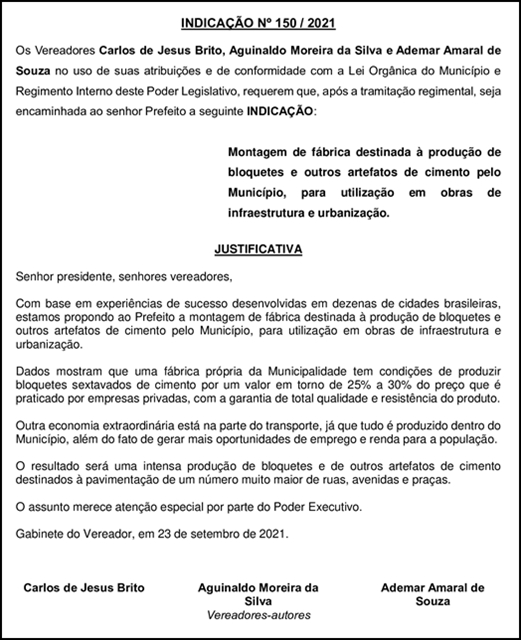Na Indicação nº 150, Carlinhos teve como parceiros no documento os colegas Ademar Amaral de Souza (Amaral – PSB) e Aguinaldo Moreira da Silva (Aguinaldo Sem Teto – PSD). O documento propõe ao chefe do Executivo a montagem de fábrica destinada à produção de bloquetes e outros artefatos de cimento pelo Município, para utilização em obras de infraestrutura e urbanização.