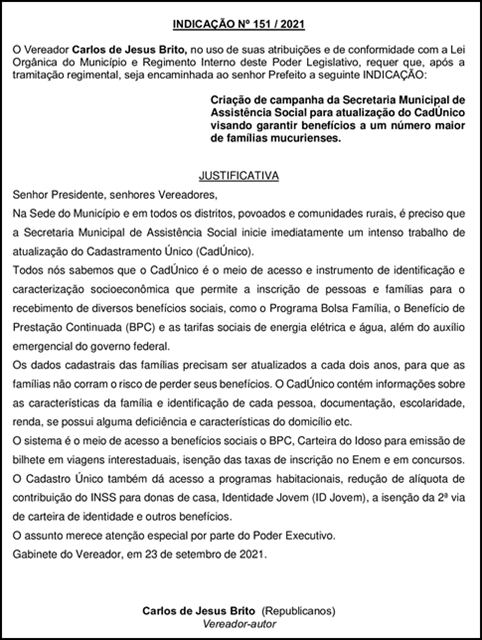 Na Indicação nº 151, de autoria individual de Carlos Brito, foi proposta a criação de campanha da Secretaria Municipal de Assistência Social para atualização do CadÚnico visando garantir benefícios a um número maior de famílias mucurienses.