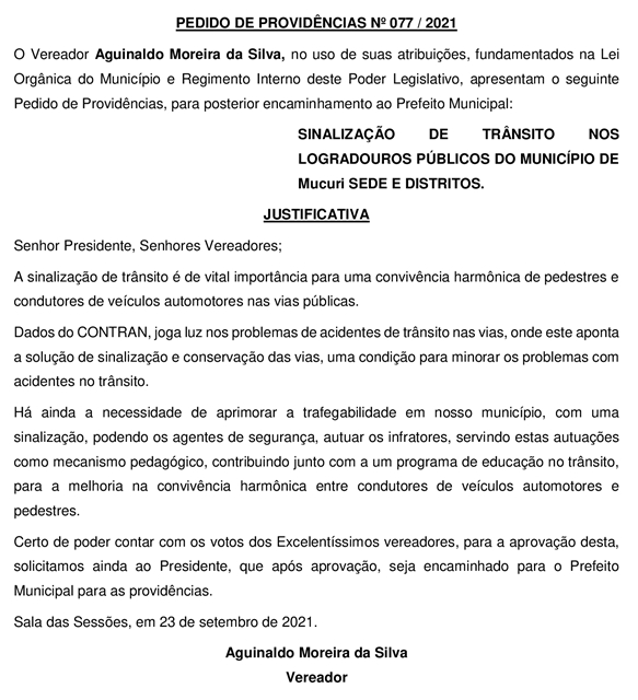 Implantar sinalização de trânsito nos logradouros públicos do município de Mucuri, na Sede e nos distritos, foi o assunto defendido pelo Vereador Aguinaldo Moreira da Silva (Aguinaldo Sem Teto – PSD) no Pedido de Providências nº 077/2021, aprovado na sessão desta terça-feira (26).