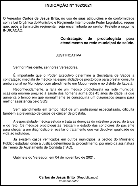 Em sua justificativa, Carlos Brito afirmou: “Reconhecidamente, a falta de um médico proctologista na rede municipal ocasiona enorme prejuízo à saúde dos homens acima dos 45 anos de idade, já que aumenta o tempo em que normalmente se conseguiria um diagnóstico seguro para melhor assistência pelo SUS.”