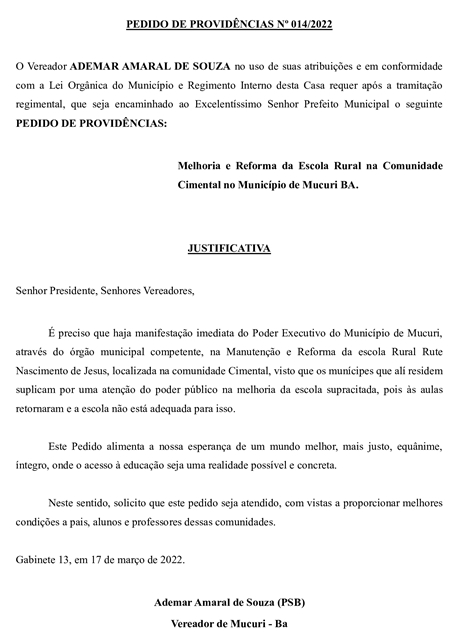 Já o Pedido de Providência nº 014/2022 trata dos serviços de melhoria e reforma da Escola na Comunidade Cimental.