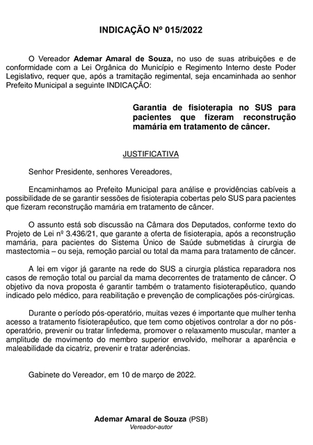 Lembrou que o assunto está sob discussão na Câmara dos Deputados, conforme texto do Projeto de Lei nº 3.436/21, que garante a oferta de fisioterapia, após a reconstrução mamária, para pacientes do Sistema Único de Saúde submetidas à cirurgia de mastectomia – ou seja, remoção parcial ou total da mama para tratamento de câncer.