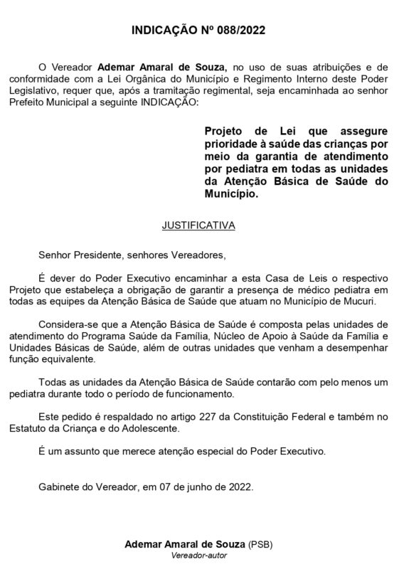 Projeto de Lei que assegure prioridade à saúde das crianças por meio da garantia de atendimento por pediatra em todas as unidades da Atenção Básica de Saúde do Município;
