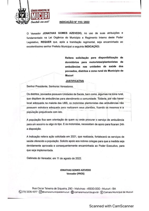 A Indicação nº 115/2022 reitera pedido de disponibilização de dormitórios para motoristas-plantonistas de ambulâncias nas unidades de saúde dos povoados, distritos e zona rural do Município.