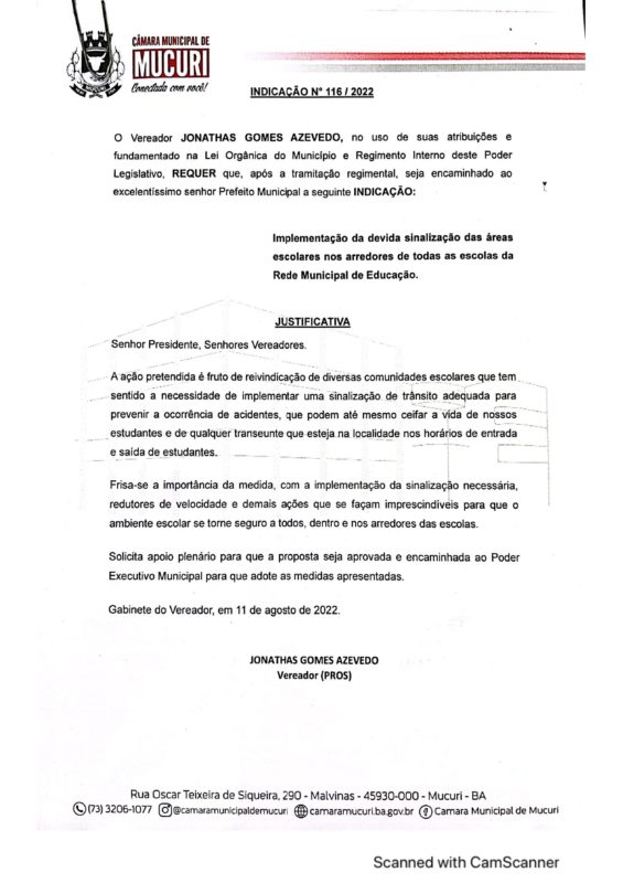 Com a Indicação nº 116/2022, Dhow reivindica implementação da devida sinalização das áreas escolares nos arredores de todas as escolas da rede municipal de educação.
