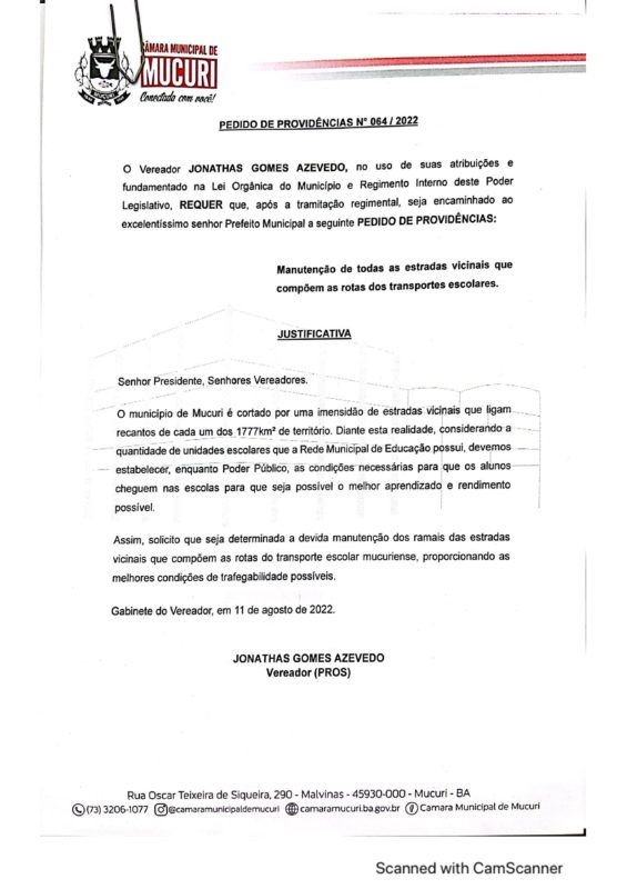 O Pedido de Providência nº 064/2022, também assinado pelo Vereador, pede a manutenção de todas as estradas vicinais que compõem as rotas do transporte escolar no Município.