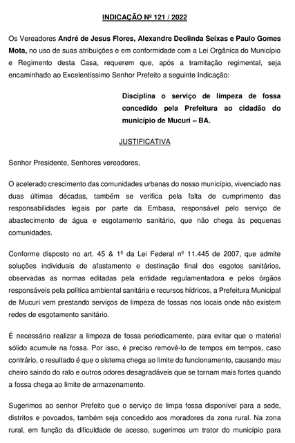 É preciso que o Município de Mucuri tenha um instrumento legal capaz de disciplinar o serviço de limpeza de fossas concedido pela Prefeitura à população. A preocupação foi manifestada por meio da Indicação nº 121/2022, assinada por três Vereadores: André de Jesus Flores (André do Sindicato – Rede), Alexandre Deolinda Seixas (Xandão Seixas – PSC) e Paulo Gomes Mota (Paulo do Carvão – PSB).