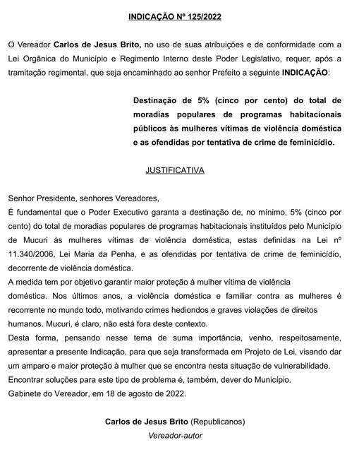 Outra proposição apresentada por Brito foi a de nº 125/2022, que defende a destinação de 5% (cinco por cento) do total de moradias populares de programas habitacionais públicos às mulheres vítimas de violência doméstica e as ofendidas por tentativa de crime de feminicídio.
