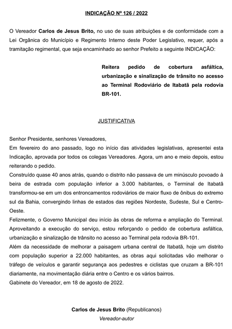 Reforçando mais uma vez o pedido que foi feito no início do ano passado, o Vereador Carlos de Jesus Brito (Carlinhos da Ótica – Republicanos) novamente apresentou na Câmara, durante a reunião dessa terça-feira (23/08), a Indicação (nº 126/2022) que reivindica cobertura asfáltica, urbanização e sinalização de trânsito no acesso ao Terminal Rodoviário de Itabatã pela rodovia BR-101.