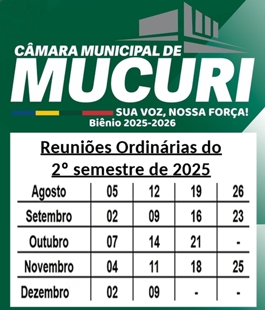 Conforme o Projeto de Resolução Nº 002/2024, que definiu o Calendário Legislativo para 2025, os Vereadores de Mucuri nesta Legislatura 2025-2028 retornam às atividades legislativas logo na primeira terça-feira de agosto, dia 05, às 9h, com a realização da 17ª Reunião Ordinária.