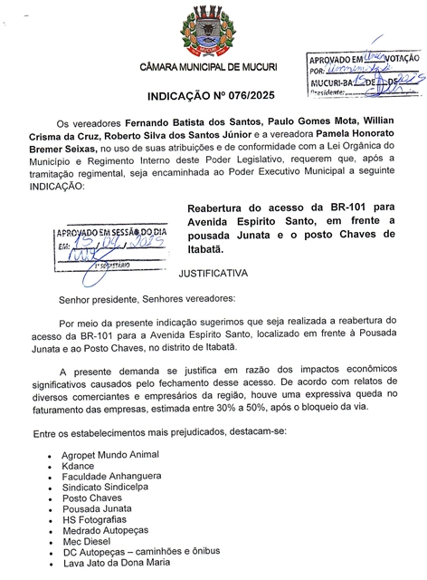 Os Vereadores Fernando Batista dos Santos (Fernando da Gazzinelli – Republicanos), Paulo Gomes Mota (Paulo do Carvão – PSB), Willian Crisma da Cruz (Willian Crisma – Podemos), Roberto Silva dos Santos Júnior (Roberto Jr. – União Brasil) e a Vereadora Pamela Honorato Bremer Seixas (Pamela Seixas – Podemos) assinam em conjunto a Indicação nº 076/2025, aprovada durante a reunião desta terça-feira (15/04), que solicita a reabertura do acesso da BR-101 para Avenida Espirito Santo, em frente a Pousada Junata e o Posto Chaves, de Itabatã.