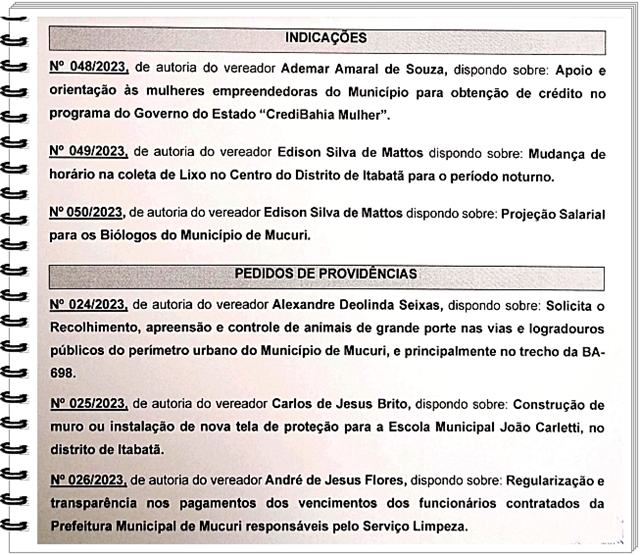 A 8ª Reunião Ordinária da Câmara de Mucuri, realizada nesta terça-feira (25/04), assinalou a aprovação das seis proposições que constavam na pauta, divididas em três Indicações e três Pedidos de Providências, todas de autoria dos Vereadores.