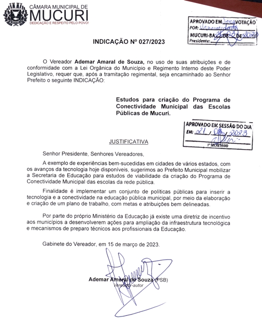 O Vereador Ademar Amaral de Souza (Amaral – PSB) é o autor da Indicação nº 027/2023, que solicita do Poder Executivo estudos para a criação do Programa de Conectividade Municipal das Escolas Públicas de Mucuri. O documento foi aprovado na sessão desta terça-feira (21/03).