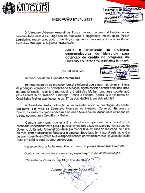 Apoio e orientação às mulheres empreendedoras do Município para obtenção de crédito no programa do Governo do Estado “CrediBahia Mulher”. Esta é a proposta do Vereador Ademar Amaral de Souza (Amaral – PSB), autor da Indicação nº 048/2023, aprovada por unanimidade na 8ª Reunião Ordinária, nesta terça-feira (25/04).