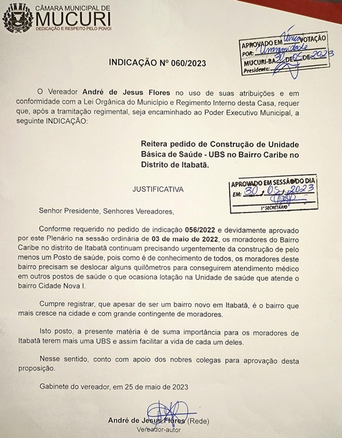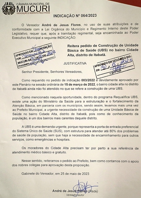 Com a Indicação nº 060/2023, André reiterou pedido de construção de uma UBS no bairro Caribe, em Itabatã, reapresentando conteúdo da Indicação nº 056/2022, aprovada na reunião de 03 de maio do ano passado.