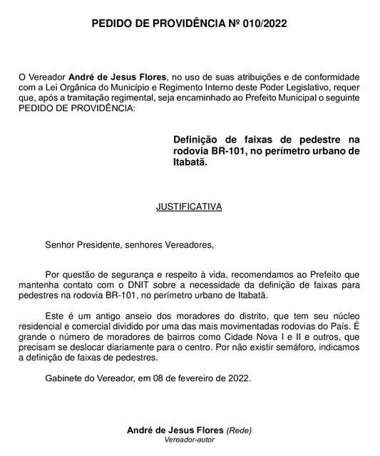 O Pedido de Providências nº 010/2022, apresentado pelo Vereador André de Jesus Flores (André do Sindicato – Rede), justifica ser “questão de segurança e respeito à vida” que o Poder Executivo mantenha contato com o DNIT sobre a necessidade da definição de faixas para pedestres na rodovia BR-101, no perímetro urbano de Itabatã.