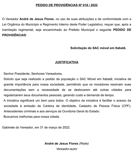 Com o Pedido de Providência nº 018/2022, aprovado na reunião dessa terça-feira (12/4), o Vereador André de Jesus Flores (André do Sindicato – Rede) solicitou ao Prefeito Municipal providências no sentido de garantir a prestação de serviços do SAC Móvel no distrito de Itabatã.
