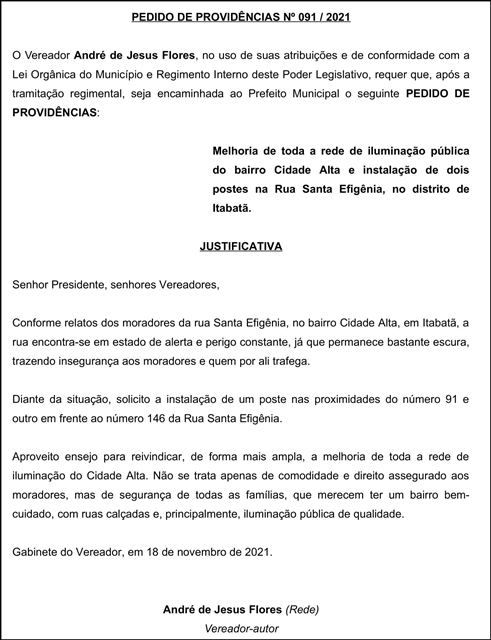 PEDIDO DE PROVIDÊNCIAS Nº 091/2021