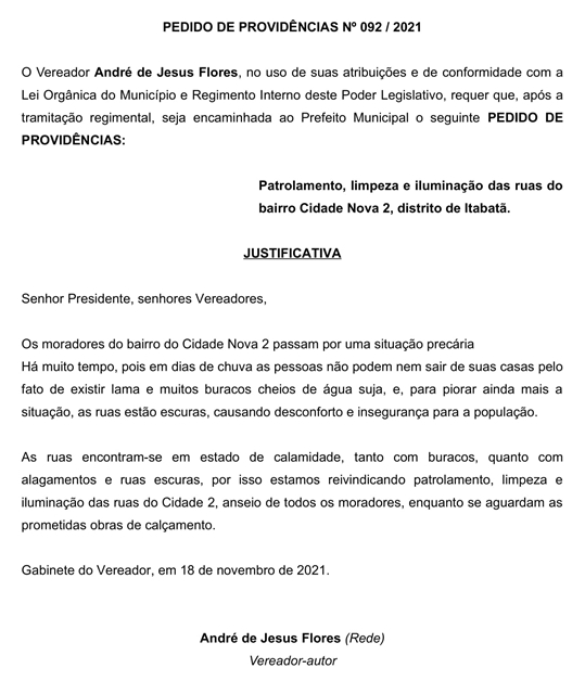 PEDIDO DE PROVIDÊNCIAS Nº 092/2021