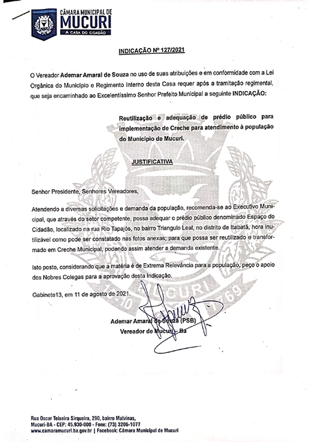 Na Indicação nº 127/2021, o autor propõe ao Prefeito a reutilização e adequação de prédio público para implementação de creche destinada a atender a população do Município.