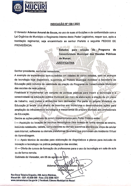 Na Indicação nº 130/2021, Amaral recomendou estudos para criação do Programa de Conectividade Municipal das Escolas Públicas de Mucuri.