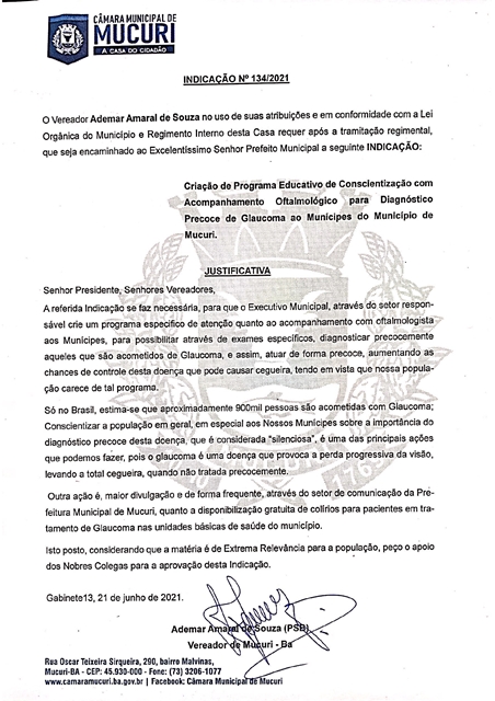 O terceiro documento do Vereador foi a Indicação nº 134/2021, que trata da criação de Programa Educativo de Conscientização com Acompanhamento Oftalmológico para Diagnóstico Precoce de Glaucoma.