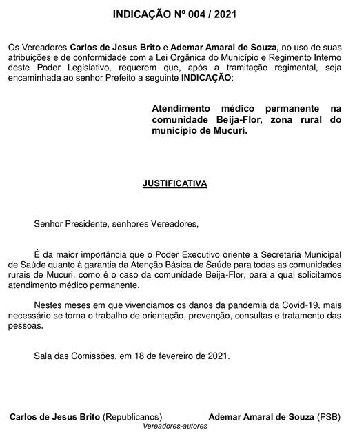 Atendimento médico permanente na comunidade Beija-Flor, zona rural do município de Mucuri, é o conteúdo da Indicação Nº 004/2021, aprovada na Reunião da semana passada. Autoria do documento é dos Vereadores Carlos de Jesus Brito (Carlinhos da Ótica – Republicanos) e Ademar Amaral de Souza (Amaral – PSB).