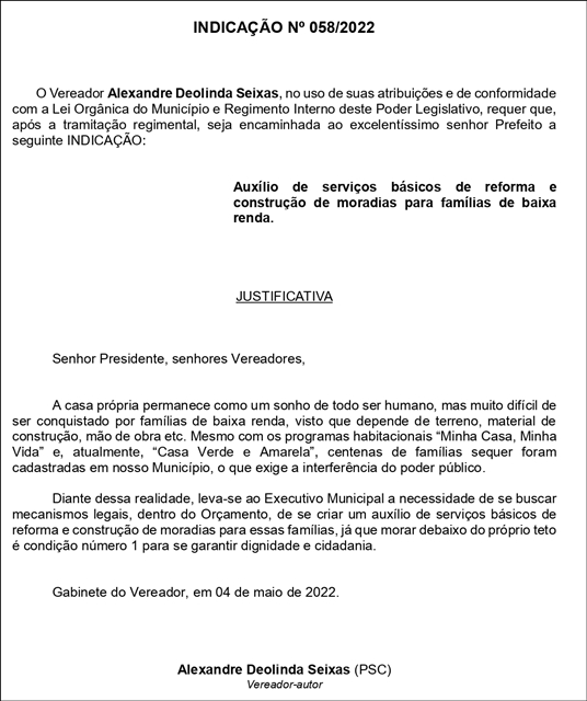 A justificativa é do Vereador Vereador Alexandre Deolinda Seixas (Xandão Seixas – PSC), que apresentou a Indicação nº 058/2022, aprovada por unanimidade na reunião de terça-feira (10/05). O documento propõe auxílio de serviços básicos de reforma e construção de moradias para famílias de baixa renda.
