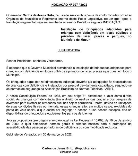 INDICAÇÃO Nº 027/2022