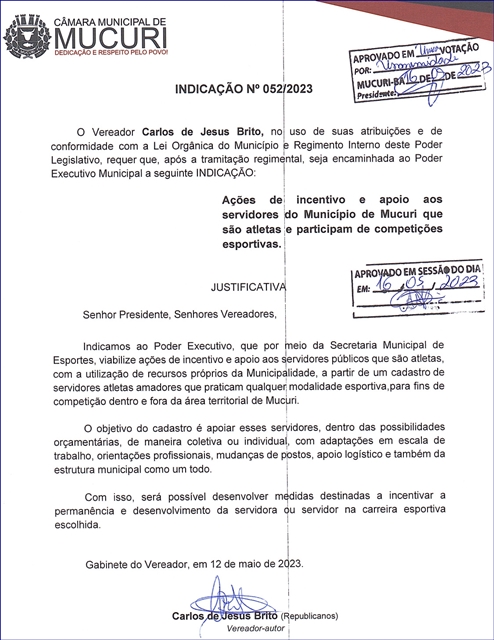 Na opinião de Carlos Brito, o Poder Executivo, por meio da Secretaria de Esportes, deve garantir esse apoio com a utilização de recursos próprios do Município, com a utilização de um cadastro de servidores atletas amadores que praticam qualquer modalidade esportiva, para fins de competição dentro e fora da área territorial de Mucuri.