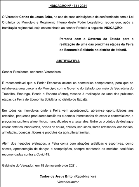 Uma parceria do Município com o Governo do Estado, para a realização de uma das próximas etapas da Feira de Economia Solidária no distrito de Itabatã, foi proposta pelo Vereador Carlos de Jesus Brito (Carlinhos da Ótica – Republicanos), ao apresentar a Indicação nº 174/2021.
