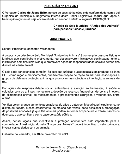 Com a Indicação nº 175/2021, Brito pediu a criação do Selo Municipal “Amigo dos Animais” em Mucuri.