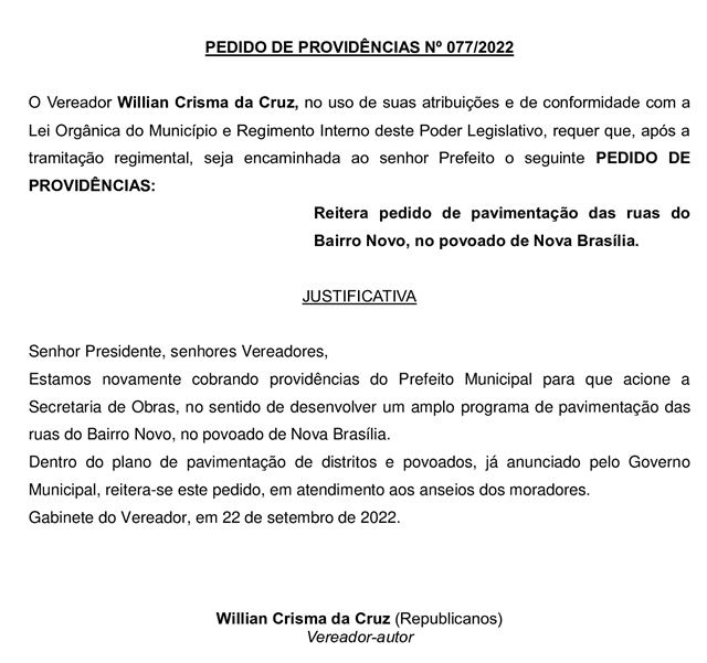 PEDIDO DE PROVIDÊNCIA Nº 077/2022, de autoria do Vereador Willian Crisma da Cruz dispondo sobre: Reitera pedido de pavimentação das ruas do Bairro Novo, no povoado de Nova Brasília;