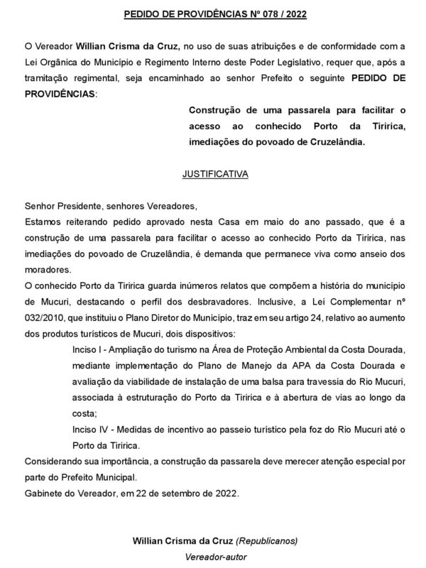 PEDIDO DE PROVIDÊNCIA Nº 078/2022, de autoria do Vereador Willian Crisma da Cruz dispondo sobre: Construção de uma passarela para facilitar o acesso ao conhecido Porto da Tiririca, imediações do povoado de Cruzelândia.