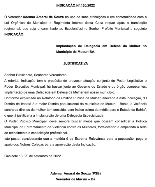 Nº 160/2022, de autoria do Vereador Ademar Amaral de Souza dispondo sobre: Implantação de Delegacia em Defesa da Mulher no Município de Mucuri.