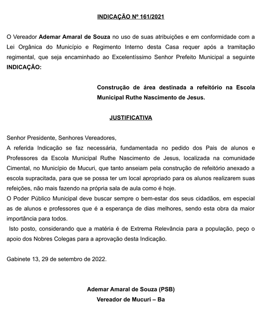 Nº 161/2022, de autoria do Vereador Ademar Amaral de Souza dispondo sobre: Construção de área destinada a refeitório na Escola Municipal Ruthe Nascimento de Jesus.