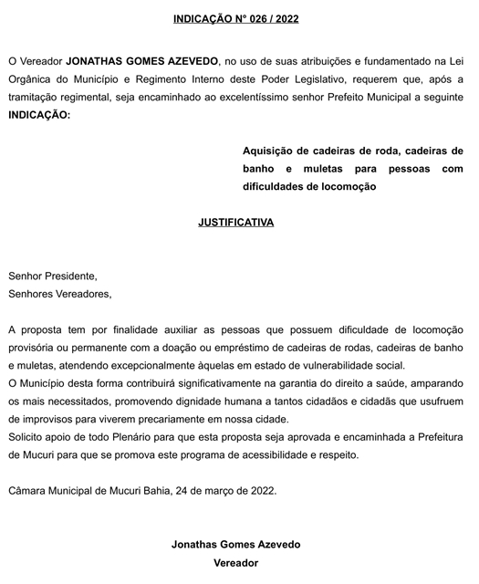 Aprovada por unanimidade a Indicação nº 026/2022, autoria do Vereador Jonathas Gomes Azevedo (Dhow da Divisa – PROS), durante a Reunião Ordinária dessa terça-feira (05/04), que recomenda ao Chefe do Executivo a aquisição de cadeiras de roda, cadeiras de banho e muletas para pessoas com dificuldades de locomoção.