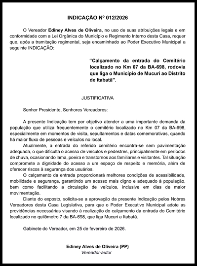 Atualmente, a entrada do referido cemitério encontra-se sem pavimentação adequada, o que dificulta o acesso de veículos e pedestres, principalmente em períodos de chuva, ocasionando lama, poeira e transtornos aos familiares e visitantes. Tal situação compromete a dignidade do acesso a um espaço de respeito e memória, além de oferecer riscos à segurança dos usuários.