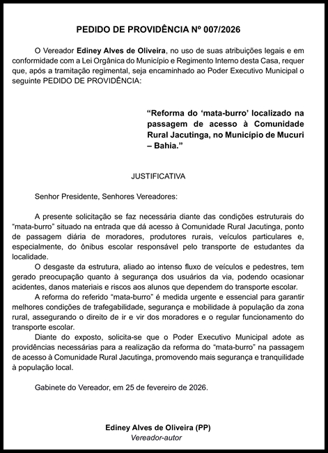 A solicitação se faz necessária diante das condições estruturais do “mata-burro” situado na entrada que dá acesso à Comunidade Rural Jacutinga, ponto de passagem diária de moradores, produtores rurais, veículos particulares e, especialmente, do ônibus escolar responsável pelo transporte de estudantes da localidade.