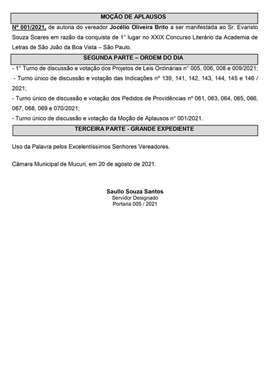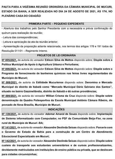 A Câmara Municipal de Mucuri publicou nesta sexta-feira (20/08) a Pauta oficial das atividades legislativas da 20ª Reunião Ordinária, marcada para a próxima, 24 de agosto de 2021, às 17 horas, no Plenário Casa do Cidadão.