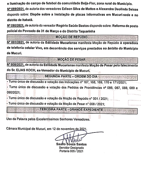 A Câmara Municipal de Mucuri publicou na manhã desta sexta-feira (12/11) a Pauta oficial das atividades legislativas da 28ª Reunião Ordinária, marcada para a próxima terça-feira, 16 de novembro de 2021, às 17 horas, no Plenário Casa do Cidadão.