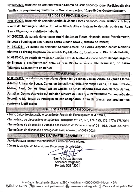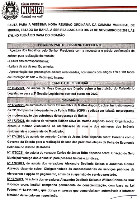 A Câmara Municipal de Mucuri publicou na manhã desta sexta-feira (19/11) a Pauta oficial das atividades legislativas da 29ª Reunião Ordinária, marcada para a próxima terça-feira, 23 de novembro de 2021, às 17 horas, no Plenário Casa do Cidadão.