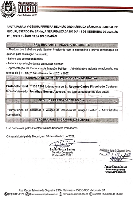A Câmara Municipal de Mucuri publicou na sexta-feira passada (10/09) a Pauta oficial das atividades legislativas da 21ª Reunião Ordinária, marcada para esta terça-feira, 14 de setembro de 2021, às 17 horas, no Plenário Casa do Cidadão.
