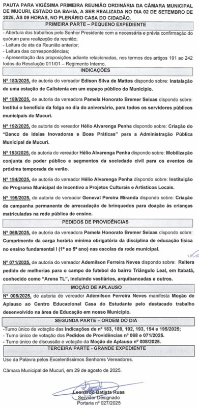 A Pauta oficial da 21ª Reunião Ordinária de 2025, confirmada para a próxima terça-feira, dia 02 de setembro, às 9h, no Plenário Casa do Cidadão, foi publicada no Diário Oficial do Poder Legislativo Municipal na tarde desta sexta-feira (29/08).