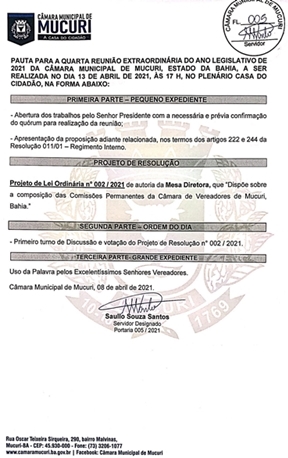 A Câmara Municipal de Mucuri publicou nesta quinta-feira (08/04) a Pauta oficial das atividades legislativas da 4ª Reunião Extraordinária, marcada para a próxima terça-feira, 13 de abril de 2021, às 17 horas, no Plenário Casa do Cidadão.