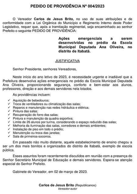 O Pedido de Providência nº 004/2023, autoria do Vereador Carlos de Jesus Brito (Carlinhos da Ótica – Republicanos), aprovado na terça-feira passada (07/03), relaciona os serviços que precisam ser feitos.