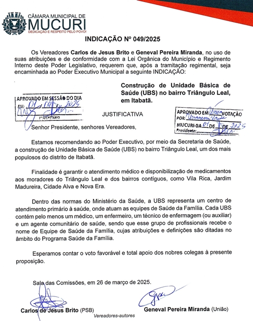A Indicação nº 049/2025 leva ao Prefeito a necessidade de construção de Unidade Básica de Saúde (UBS) no bairro Triângulo Leal.