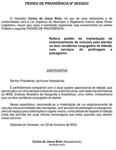 O Vereador Carlos de Jesus Brito (Carlinhos da Ótica – Republicanos) reiterou mais uma vez, durante a sessão de terça-feira passada (28/02), o pedido de implantação de estacionamento de veículos para atender os dois cemitérios conjugados de Itabatã, com serviços de jardinagem e paisagismo.