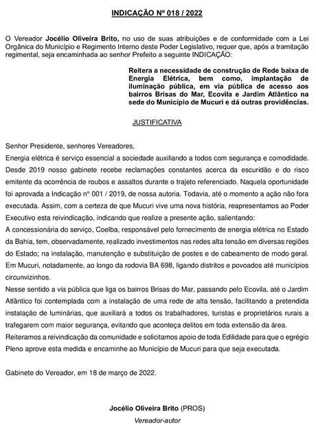 Com a Indicação nº 018/2022, o Presidente da Câmara reitera a necessidade de construção de rede baixa de energia elétrica, bem como implantação de iluminação pública em vias públicas de acesso aos bairros Brisas do Mar, Ecovila e Jardim Atlântico, na sede do Município de Mucuri.